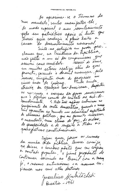 I feel satisfied to be able to state that, in my term as President of the republic, I did not fail in any of the commitments I made as a candidate. I thank God for the chance to fulfill even more than my repeatedly stated promise to advance Brazil by at least fifty years in only five years of government. Through the Pan-American movement I could wake hopes and mobilize energies among American peoples with the common objective to combat underdevelopment. All these efforts culminated in the achievement of democracy as our country showed the world an admirable example of political maturity, which allowed me to complete my term in an atmosphere of peace, order, prosperity and respect towards all the constitutional powers.