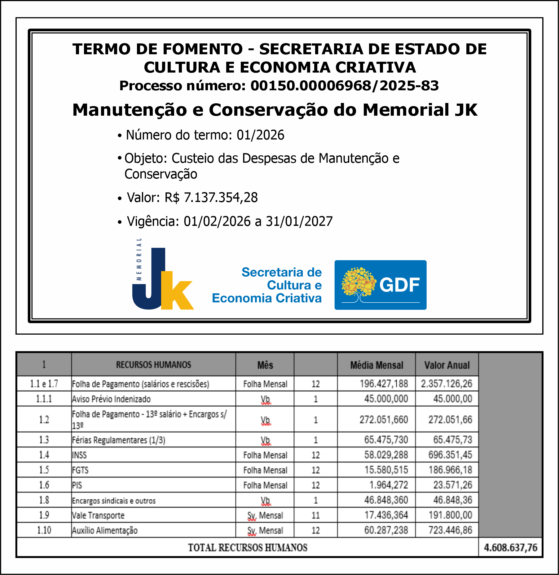 Termo de Fomento 01/2025 – Secretaria de Estado de Cultura e Economia Criativa do DF com a Sociedade Civil Memorial JK